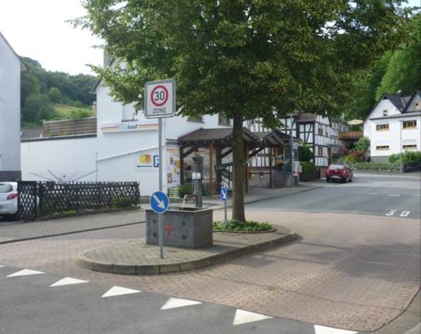 Die Brunnenanlage am Dorfplatz in der Goldbachstraße (beim nahkauf) dient in erster Linie der Verkehrsberuhigung, die Anlage ist funktional und von Verkehrsschildern umrahmt.