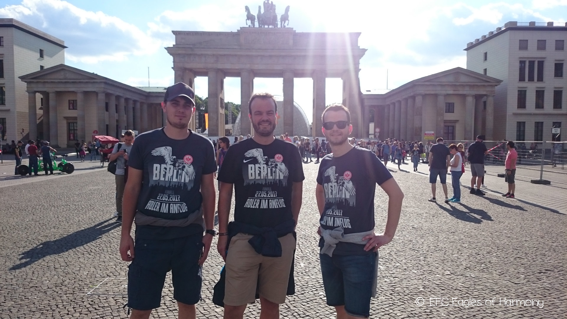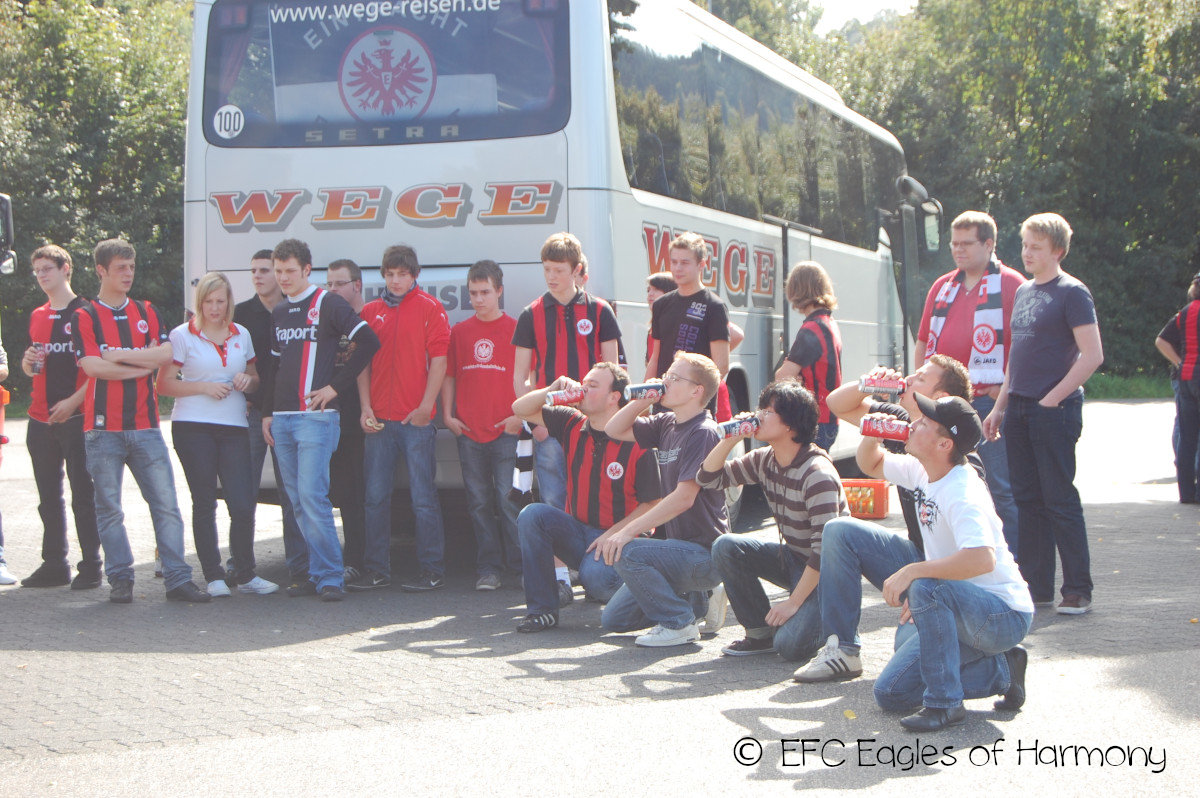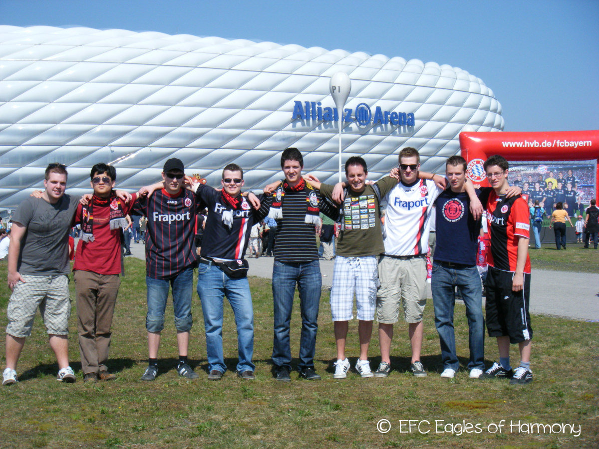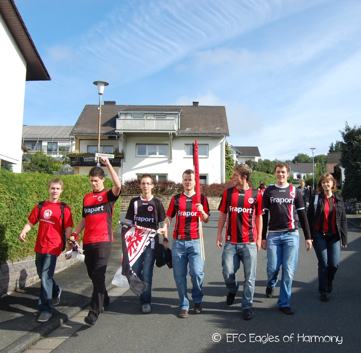 So brechen die Frankfurter Jungs (und Mädels) mindestens alle zwei Wochen – meist mit dem Zug – in Richtung Waldstadion (Commerzbank-Arena) auf, um dort ihre Eintracht bei deren Heimspielen zu unterstützen. In den letzten Jahren EFC Eagles of Harmony sind so über 200 Heimspiel-Besuche zustande gekommen. Unzählige emotionale Momente in der Nordwestkurve konnten miterlebt werden.