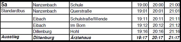Wie gewohnt, wurde auch dieses Jahr ein Shuttle-Bus-Service eingerichtet. Ab bzw. nach Nanzenbach fahren die Busse zu den folgenden Uhrzeiten. Fahrtkosten pro Fahrt: 2,00 Euro.
